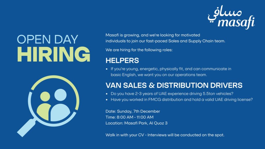Masafi is growing, and we’re looking for motivated individuals to join our fast-paced Sales and Supply Chain team.