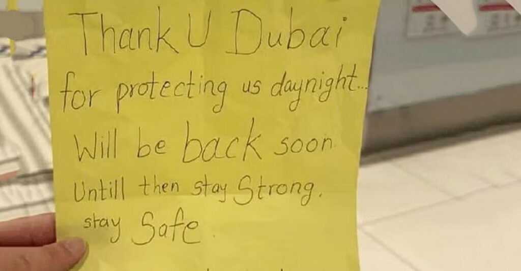 “പകലും രാത്രിയും ഞങ്ങളെ സംരക്ഷിച്ചതിന് നന്ദി ദുബായ്… ഞങ്ങൾ വേഗം തിരിച്ചുവരും. അതുവരെ കരുത്തോടെയിരിക്കുക, സുരക്ഷിതമായിരിക്കുക. ഐ ലവ് യു ദുബായ്,” എന്നായിരുന്നു ഹൃദയം തൊടുന്ന ആ വരികൾ. കൂടെ കുഞ്ഞുവരകളാൽ തീർത്ത കൊച്ചു ഹൃദയങ്ങളും ആ മഞ്ഞക്കടലാസിനെ മനോഹരമാക്കി.